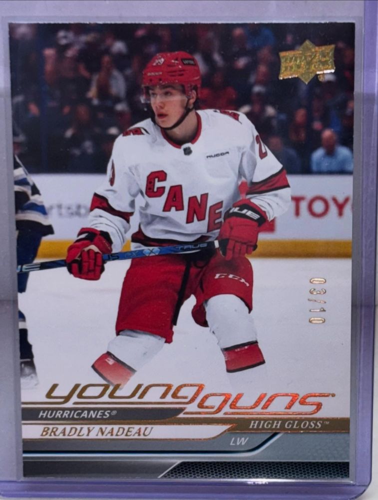 Bradly Nadeau is an emerging talent within the Carolina Hurricanes organization, and early-career rookie cards like this often serve as key investment pieces if a player’s career trajectory continues upward. As collectors increasingly focus on low-numbered rookie parallels, cards like this High Gloss /10 offer both exclusivity and the potential to become cornerstone pieces in future NHL collections.
